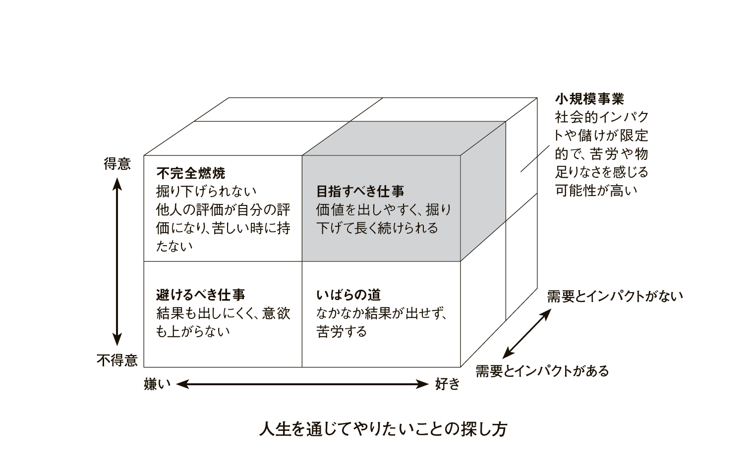 自分の人生を通じてやりたいことには、「好き」なことに自分が「得意」なことを通して取り組むことが重要だと思う。好きでも得意なことを武器にしてそれに取り組めなければ苦労する。得意なことでも好きでなければ、最後まで掘り下げて取り組めない。
