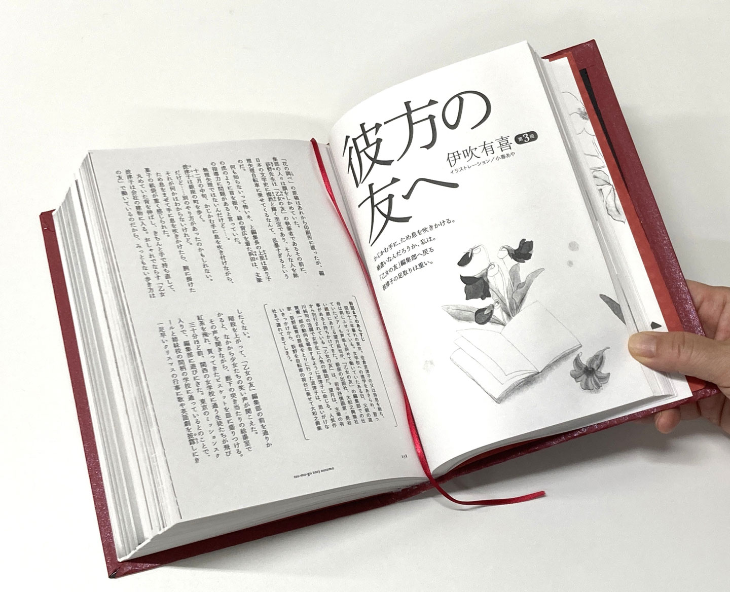 伊吹:そうなんです、彼は思いをずっと胸に秘めており……。(さらにめくりながら)そうそう。連載のときには、毎回素敵な挿絵がついていたんだ。うわぁ、懐かしい。イラストレーターは小春あやさん。可愛い挿絵だなぁ……! めちゃくちゃ素敵ですね。自分の連載に「素敵」を連発するのはおかしいかもしれないけど、挿絵と物語が共鳴するのは雑誌ならではの楽しさで。……このお手製の本には花布も、スピンもついてますね。