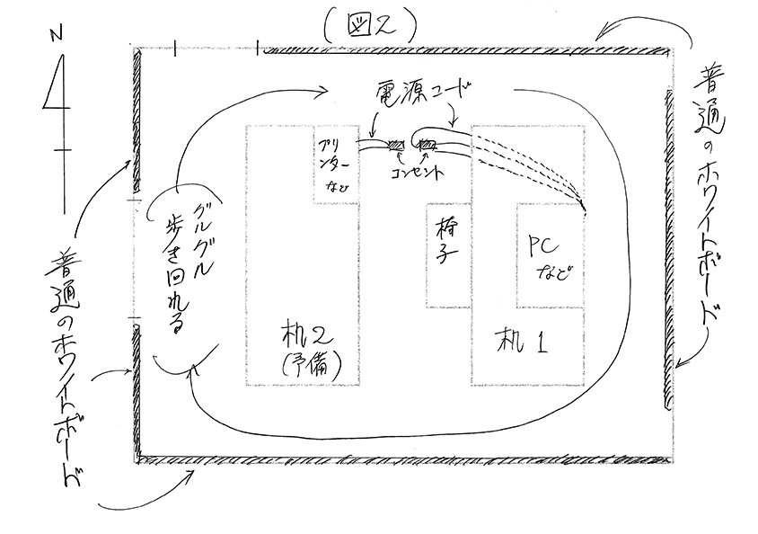 かつて、わたしの仕事部屋はこんな感じだった(図1)。紙のホワイトボードは東側と北側の壁に張っていた。この壁を見ながら常々思ったものだ。ここに紙製ではない普通のホワイトボードが欲しいな、と……(願望①)。