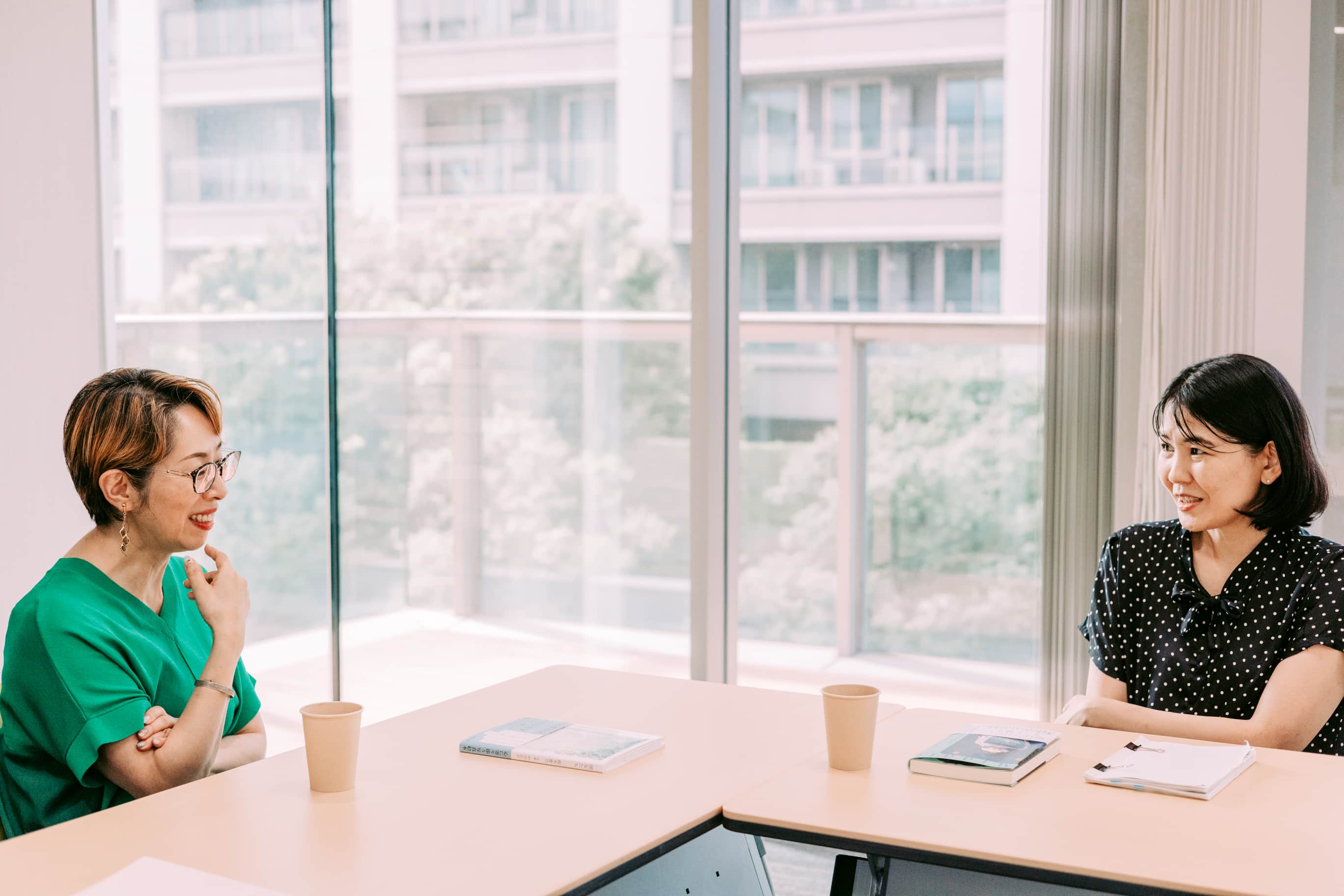 ――お⼆⼈は、仕事では初顔合わせですが、以前⼀度、お会いになったことがあるそうですね。朝⽐奈:数年前、⽇⽐⾕の書店を訪ねた時、ちょうど来店されていた桜⽊さんを書店員さんがご紹介くださって、ご挨拶したことがあるんです。今⽇は、再会できて光栄です!